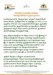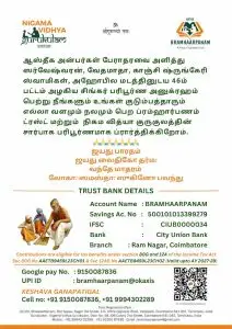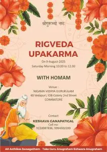 With the grace and blessings of Sarveshwara and our Acharyas, we are admitting students between 7 years and 11 years, for RIG VEDA Adhyayana, in our NIGAMA VIDHYA GURUKULAM, Situated in Shri Ayyavu Nagar 3rd Street Vedapatti Coimbatore, If the students Yagyopaveetham has not taken place, then we will do the Upanayanam here and they will be taught Vedas.